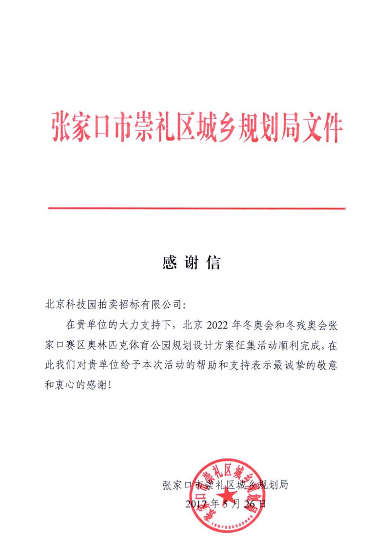 2022冬奧會(huì)和動(dòng)殘奧會(huì)張家口賽區(qū)奧林匹克體育公園規(guī)劃設(shè)計(jì)方案征集感謝信