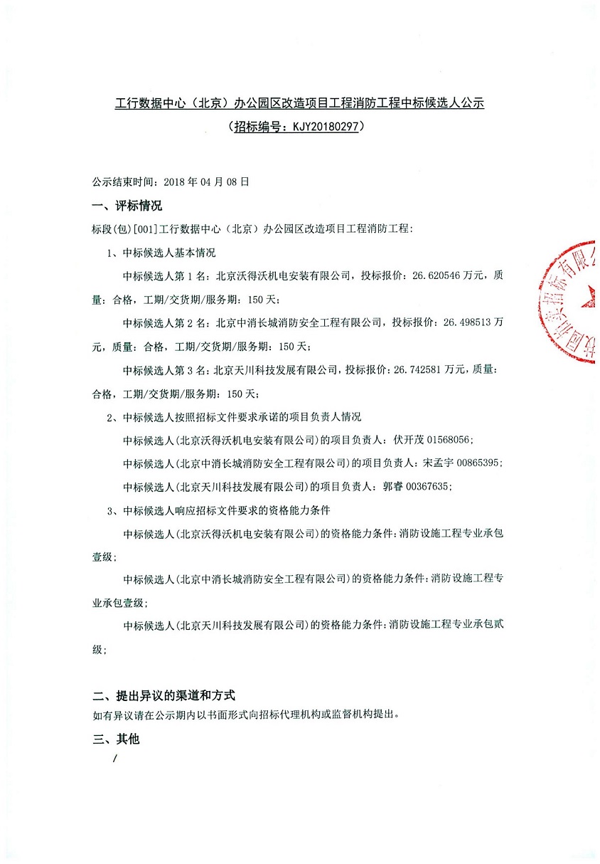 工行數(shù)據(jù)中心(北京)辦公園區(qū)改造項目工程消防工程中標(biāo)候選人公示