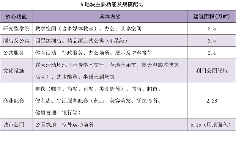 核心功能:研究型學院、酒店及酒店式公寓、公共服務、文化設施、配套商業(yè)、城市公園。